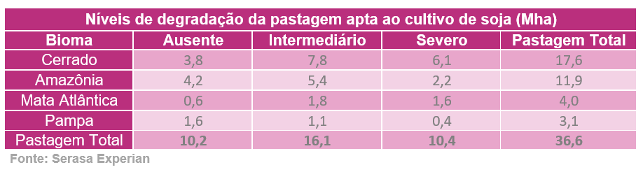 Segundo o diretor de novos negócios agro da Serasa Experian, Joel Risso, “se as projeções do Ministério da Agricultura estiverem corretas, nos próximos 10 anos veremos um aumento de cerca de 12 Mha no plantio de soja no Brasil. Esse montante representa o consumo de apenas 1/3 de toda a disponibilidade de pastagens com alta aptidão para o cultivo de soja no Brasil, que é mais de 36Mha. Essa é uma boa notícia, porque, apesar dessa disponibilidade de pastagens aptas não ser a mesma para todos os estados e regiões brasileiras, o levantamento indica que existem mais pastagens aptas que o necessário para suprir essa demanda seguindo os protocolos ambientais mais rígidos, como é o caso das recentes exigências do mercado comprador Europeu, que não deverá mais estar aberto à soja brasileira proveniente de áreas desmatadas”.Joel também explica que, “além da disponibilidade de pastagens aptas, olhar para o grau de degradação das áreas ajuda a definir a necessidade de investimentos para que esse processo de conversão ocorra. E, ao juntarmos isso com a probabilidade de inadimplência de cada de cada produtor, a informação se torna ainda mais estratégica para quem vai financiar esse processo. Queremos apoiar estrategicamente os bancos e todo o mercado financeiro a criar as melhores condições para permitir com que os produtores rurais tenham acesso ao crédito e possam expandir suas áreas, viabilizando certa previsão da demanda por investimentos, necessário à conversão das áreas, preparo e correção do solo, plantio até a colheita”.
