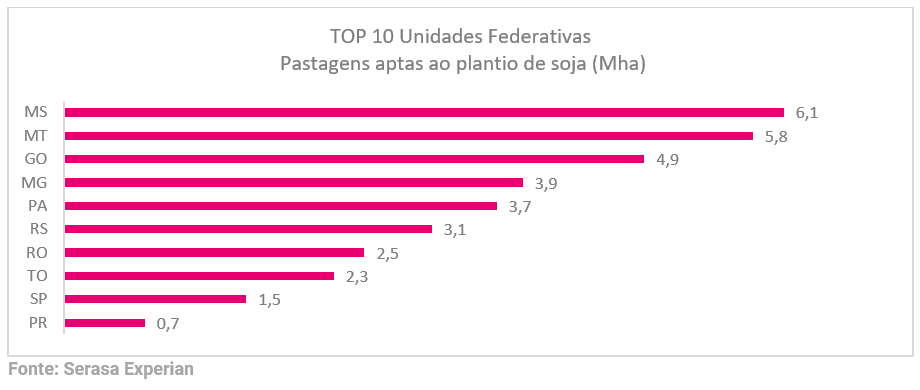 Em relação às Unidades Federativas (UF) o Pará, é o estado que dispõe da maior área de pastagens aptas ao plantio de soja e sem degradação (1,7 Mha) e o Mato Grosso do Sul é o que que possui a maior disponibilidade de pastos, com cerca de 6 Mha propícios à sojicultura. No entanto, é também nesse Estado em que se encontra a parcela mais expressiva de área degradada, proporcionalmente ao todo. Veja um TOP10 sobre as UFs no mapa abaixo: