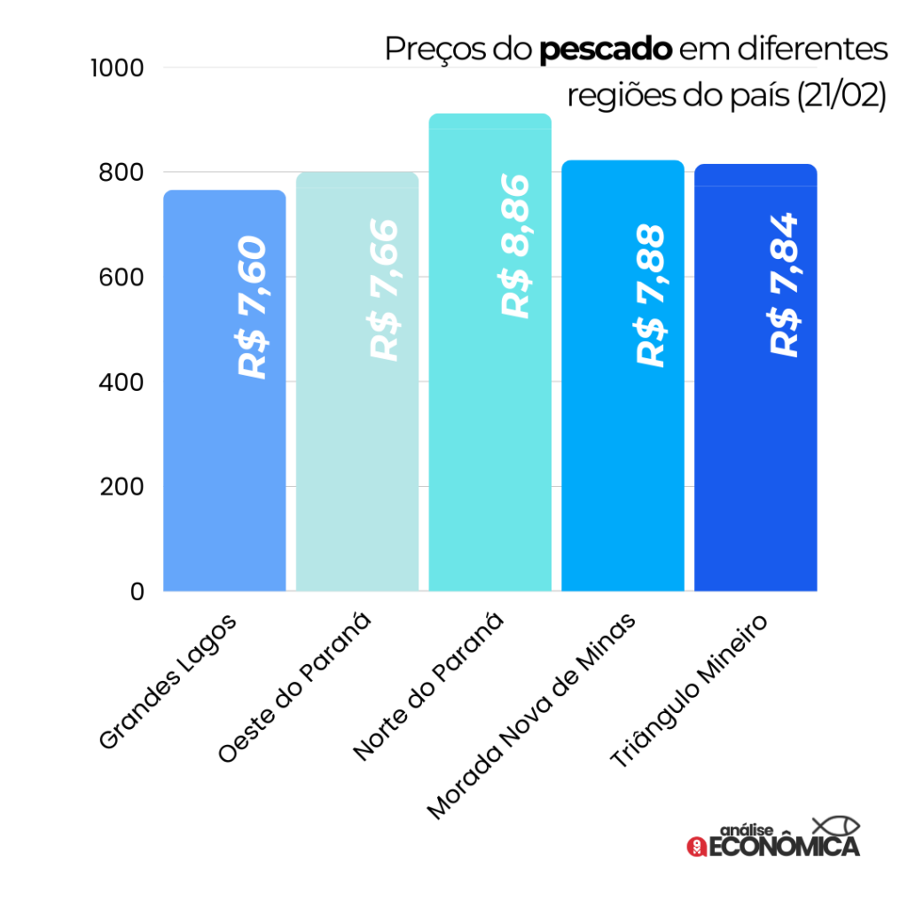 Através da análise do gráfico, podemos observar que existe uma variação significativa nos preços do pescado entre as diferentes regiões do país. A região Norte do Paraná se destaca com o preço mais elevado, enquanto os Grandes Lagos apresentam o menor preço. As demais regiões, Oeste do Paraná, Morada Nova de Minas e Triângulo Mineiro, apresentam preços intermediários.