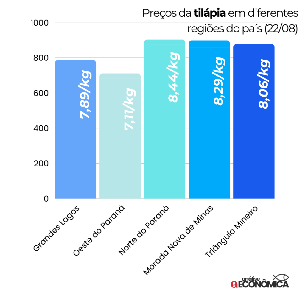 O maior valor foi observado no Norte do Paraná, onde o quilo do peixe saiu a R$ 8,44. Logo atrás, aparecem Morada Nova de Minas (MG), com R$ 8,29/kg, e o Triângulo Mineiro e Alto Paranaíba, a R$ 8,06/kg.