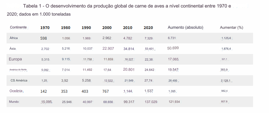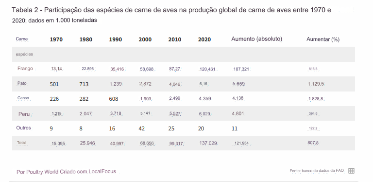 A análise anterior documentou a extraordinária dinâmica na produção de carne de aves nos últimos 50 anos. Nas décadas em análise, a produção aumentou oito vezes e atingiu um volume de quase 122 milhões de toneladas em 2020. A carne de aves de capoeira foi de longe o produto animal que mais cresce. Essa dinâmica foi principalmente resultado do notável crescimento da produção de carne de frango, que compartilhou entre 85% e quase 88% no volume total de produção.
