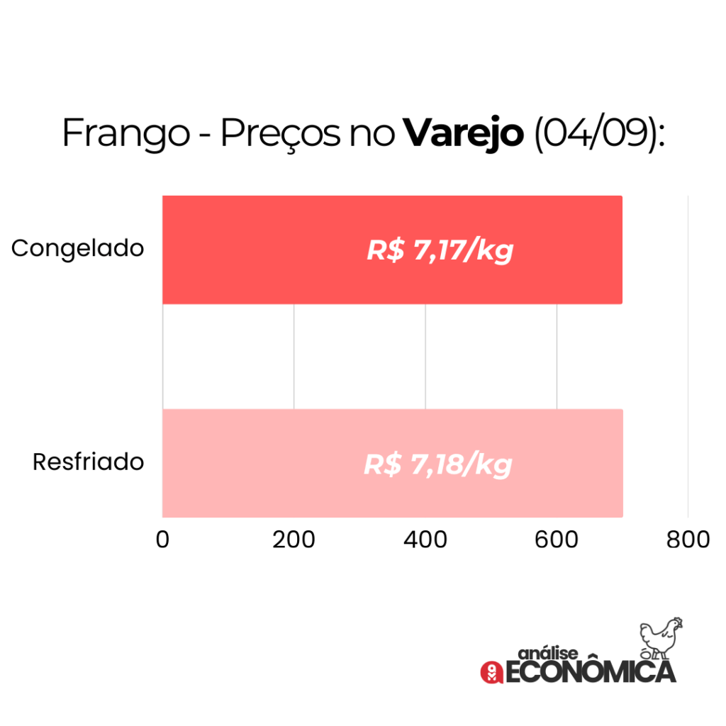 No atacado da Grande São Paulo, o frango inteiro resfriado foi comercializado, em média, a R$ 6,99/kg, valor 2,7% inferior ao de julho. Já o frango inteiro congelado apresentou desvalorização de 3,1%, sendo negociado a R$ 6,95/kg em agosto.