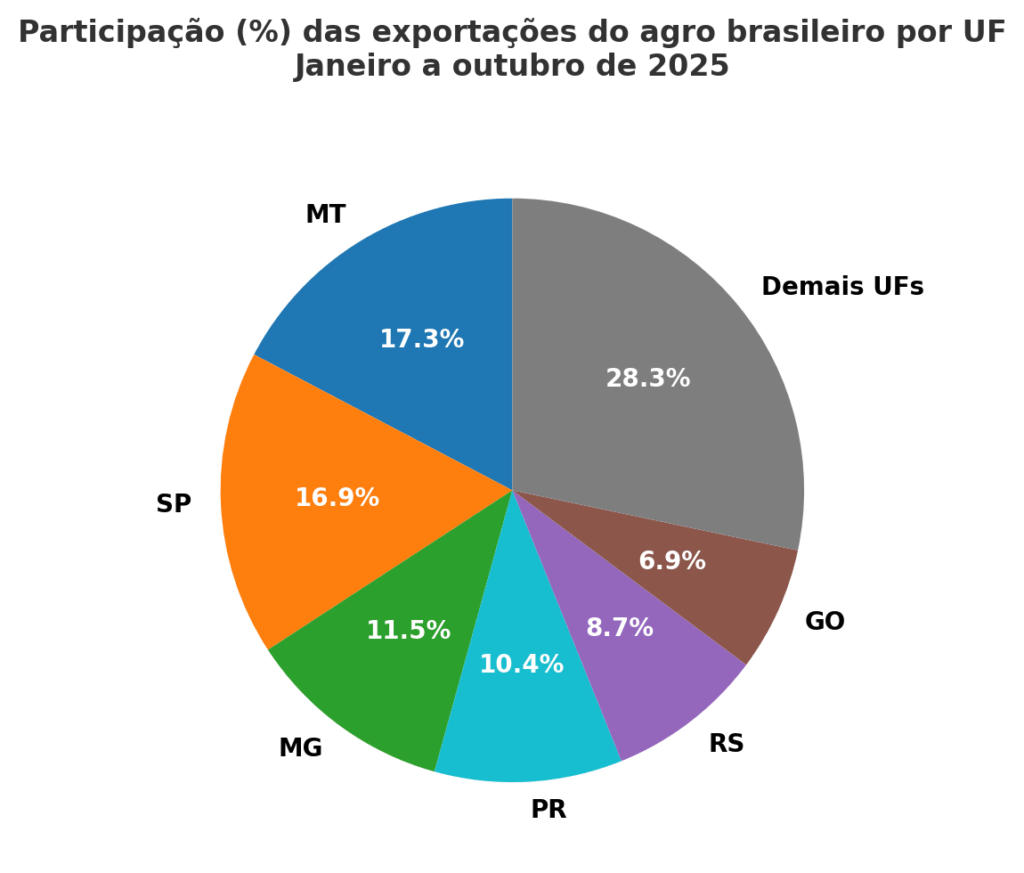 Nos dez primeiros meses de 2025, o agronegócio paulista manteve um bom desempenho no comércio exterior, alcançando um superávit de US$19,07 bilhões. O saldo positivo decorre de exportações que somaram US$23,92 bilhões e de importações que totalizaram US$4,85 bilhões. A participação das exportações do agronegócio paulista no total exportado pelo estado de janeiro a outubro de 2025 foi de 40,8%, enquanto as importações do setor corresponderam a 6,6% do total no estado.