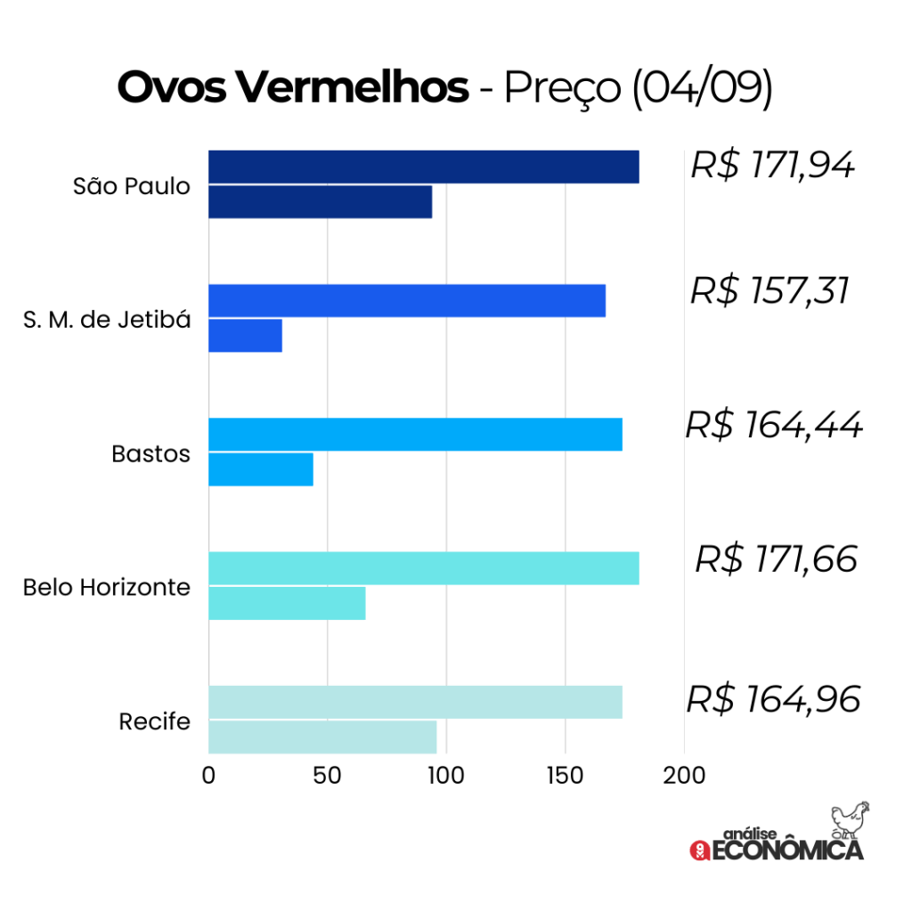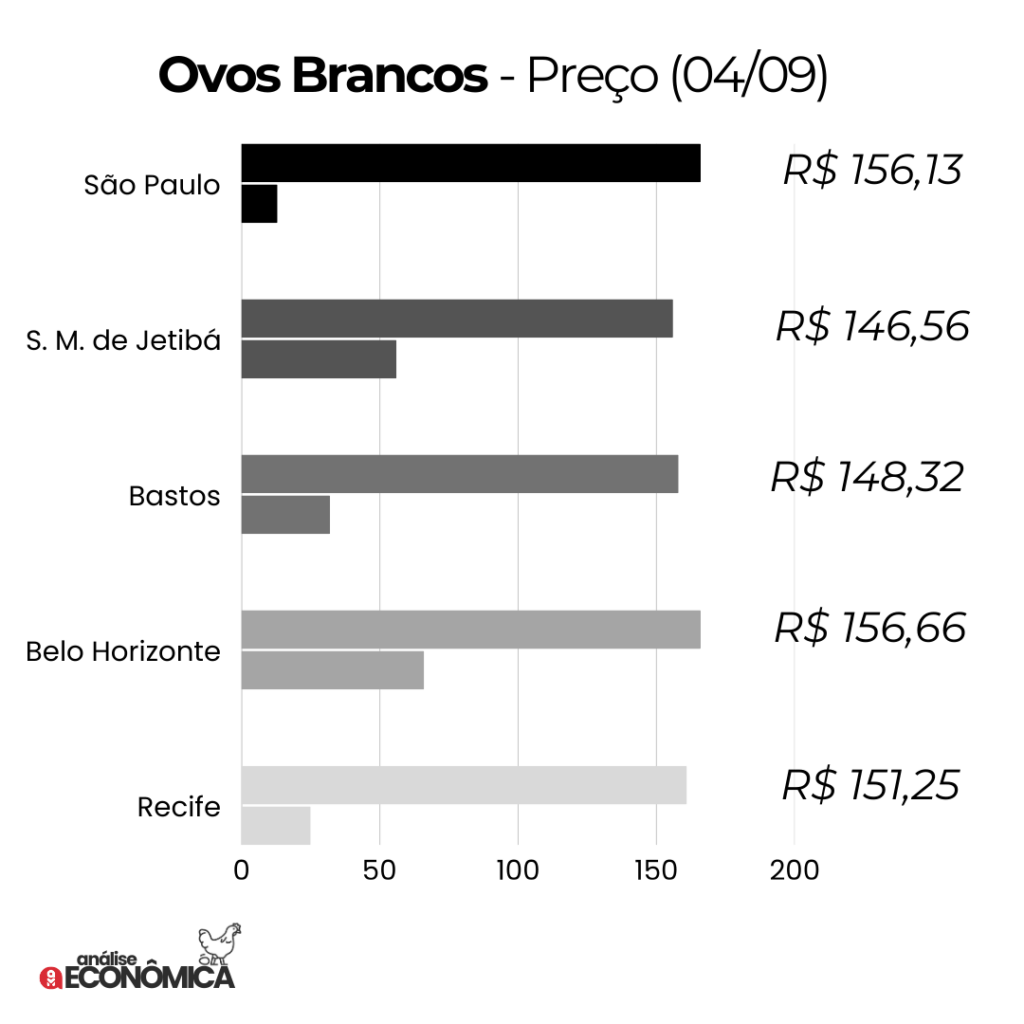 Em Bastos (SP), principal polo produtor do país, a caixa com 30 dúzias de ovos brancos tipo extra foi negociada a R$ 151,81 em agosto, valor 1,7% acima do registrado em julho. Já para o produto posto (CIF) na Grande São Paulo, a valorização foi ainda mais expressiva: 2,1%, com a caixa comercializada a R$ 158,96 no último mês.