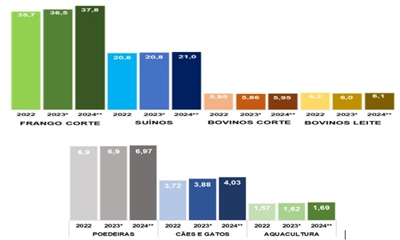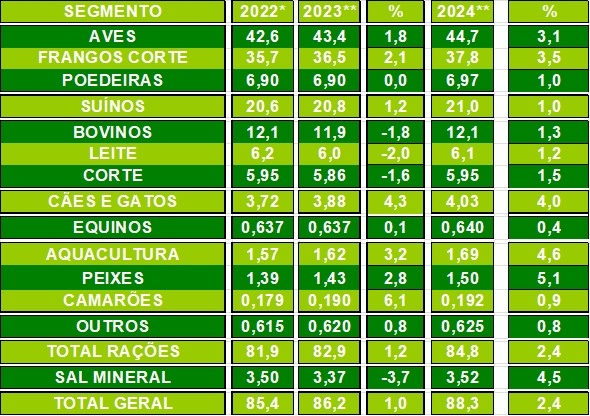 Em 2023, a produção de rações para suínos (20,8 milhões de toneladas) e para frangos de corte (36,5 milhões de toneladas), resultou, respectivamente, no avanço de 1,2% e 2,1%, enquanto para poedeiras (6,9 milhões de toneladas) manteve-se estável. Para 2024, a previsão é de incremento da ordem de 1%, 3,5% e 1%.