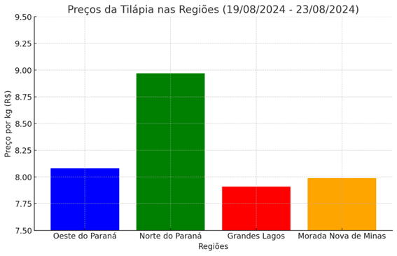 O gráfico ilustra as variações de preço entre as quatro regiões no período de 19 a 23 de agosto de 2024, conforme os dados fornecidos pelo Cepea. Podemos observar que o Norte do Paraná se destaca com o preço mais alto, enquanto os Grandes Lagos apresentam o menor valor para a tilápia. Essas diferenças refletem as distintas condições de mercado e produção em cada uma dessas regiões.