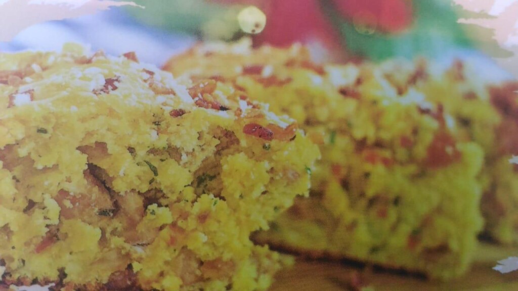 Misture o recheio a essa massa, coloque em uma forma untada e polvilhada com farinha, e finalize com o resto do coco ralado e o bacon frito.