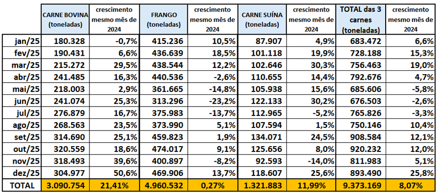 Não somente a carne suína foi destaque no crescimento da exportação, mas também a carne bovina, no segundo semestre de 2025 bateu recordes mensais sucessivos (tabela 4), o que ajudou a escoar o crescimento expressivo do abate de bovinos. A carne de frango que começou 2025 com ritmo de exportação muito bom foi prejudicada pelo foco de Influenza aviária, ocorrido em maio, no RS, mas terminou o ano voltando a crescer, depois que caíram praticamente toda as barreiras sanitárias decorrentes do foco.